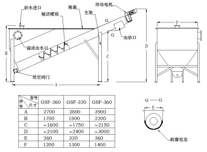 砂水混合液从分离器一端顶部输入水箱,混合液中比重较大的如砂粒等到将沉积于槽形底部,在螺旋叶片的推动下。砂粒沿斜置的u型槽底提升,离开液面后继续推移一段距离,在砂粒充分脱水后经排砂口卸至盛砂桶,而与砂分离的水则从溢流口排出,达到分离目的。